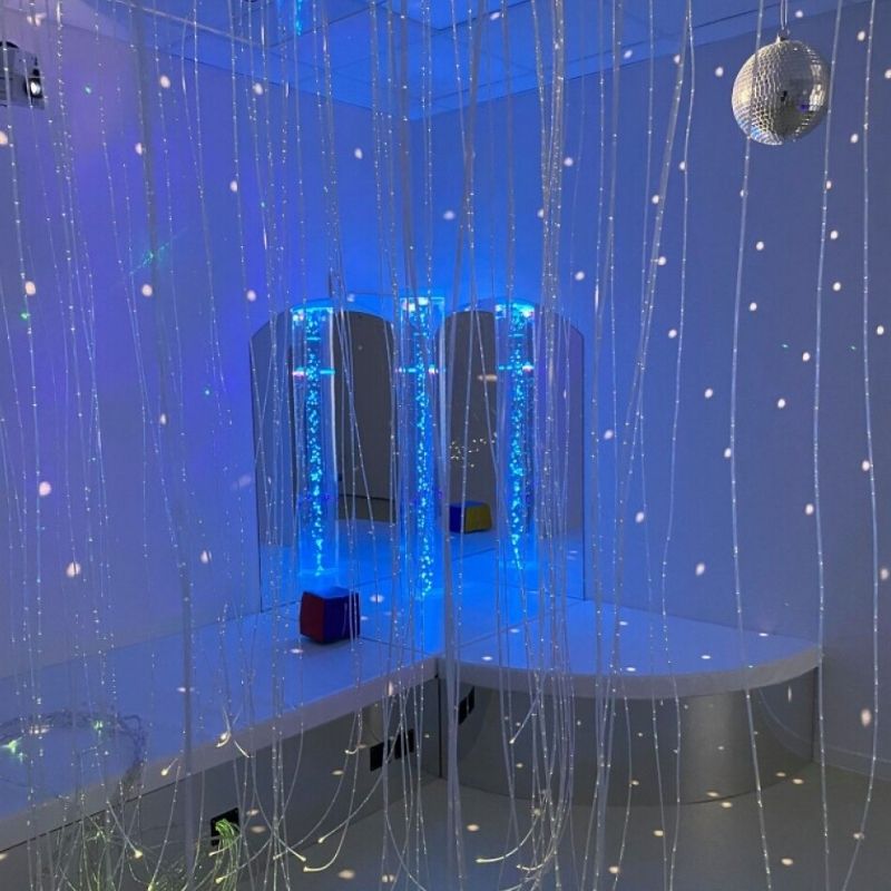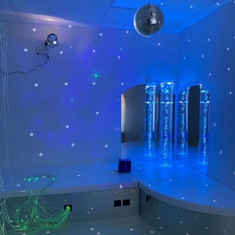 Designed as part of the Modular Sensory Room System, this cushioned corner podium securely holds one Bubble or Hurricane Tube, providing a soft and supportive seating area for users to relax and engage. The mirrored acrylic base enhances light reflections from your tube, creating a stunning visual effect that promotes calm and focus during sensory sessions.